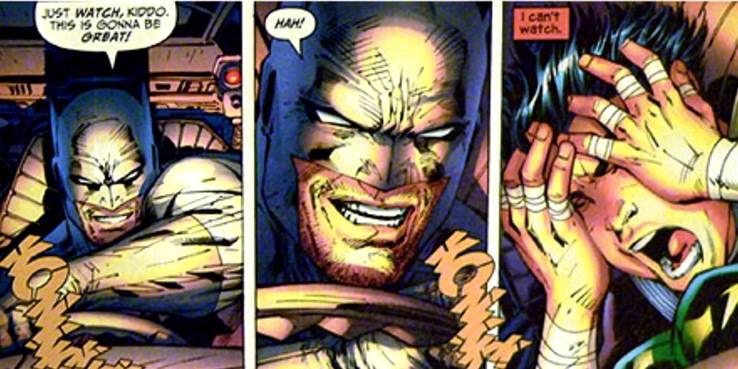 O Cavaleiro das Trevas, de Frank Miller, mudou a imagem do Batman para sempre. Sua sequência, Batman – O Cavaleiro das Trevas 2, foi tão ruim que fez todo mundo questionar se o original só não era uma paródia estranha que deu certo. Então Grandes Astros: Batman e Robin chegou e… fez os fãs desistirem.Esta história exagerada apresenta muitas ações questionáveis por parte do Batman. Ele põe fogo em bandidos, atropela carros da polícia e se pinta de amarelo para sequestrar Hal Jordan. Mas a maneira como ele trata o jovem Dick Grayson é a pior.