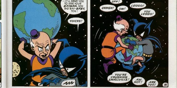 Enquanto Mxyzptlk odeia o Superman, Bat-Mirim adora o Batman. Os dois têm uma intensa discussão sobre quem é melhor, como acontece com os internautas por aí, e sozinhos destroem a continuidade de O Reino do Amanhã, o mundo de O Cavaleiro das Trevas de Frank Miller e o universo de animações da DC. Como isto pode ser cânone?